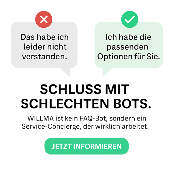 WILLMA Connect bündelt Ihr Wissen in einem zentralen KI-Assistenten und beantwortet wiederkehrende Fragen automatisiert – auf Website, WhatsApp & Co. Wir kümmern uns um Betrieb, Inhalte und Qualität.